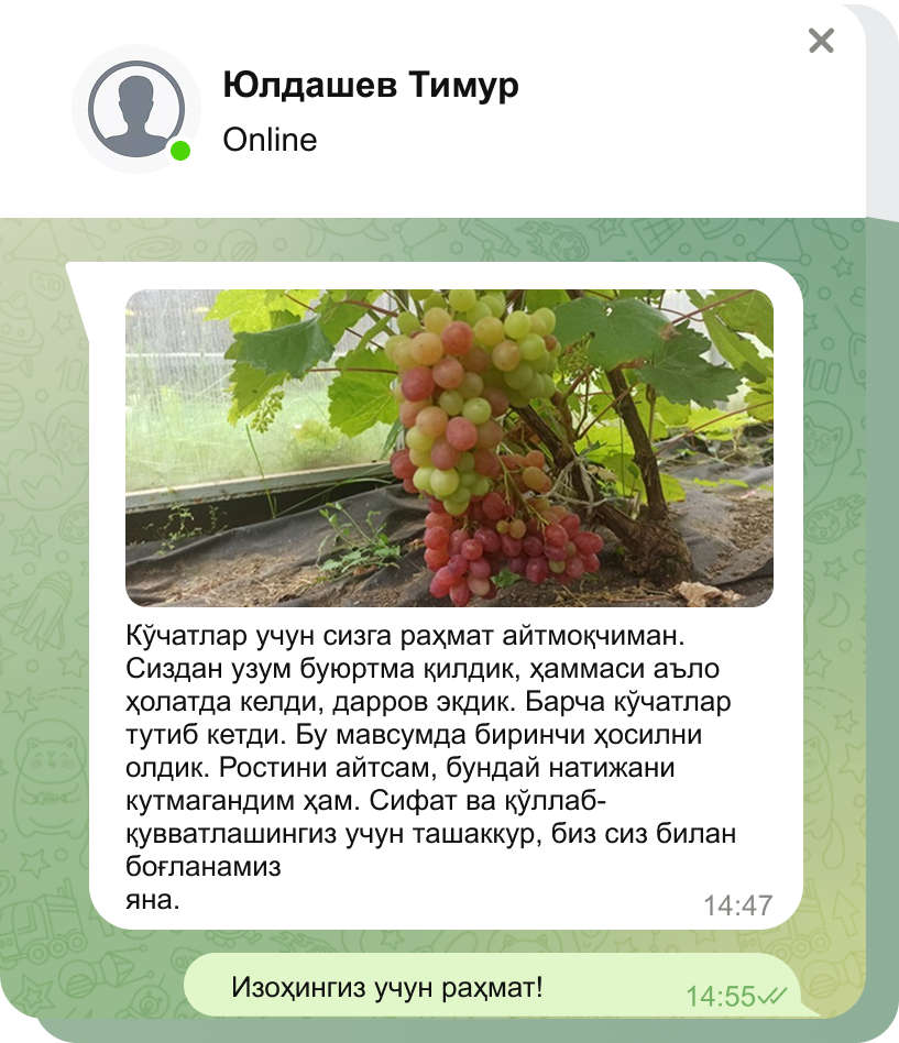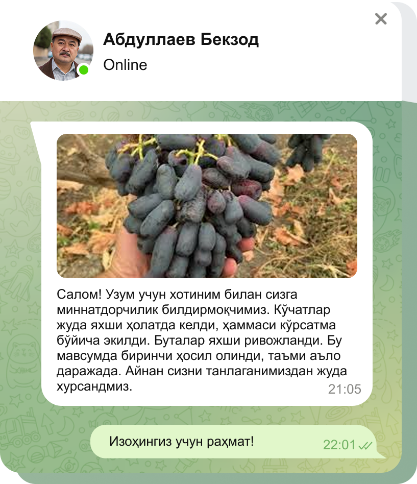 Кўчатлар узумзорингизнинг соғлом бошланишини таъминлаш учун меҳр ва ғамхўрлик билан парвариш қилинади.