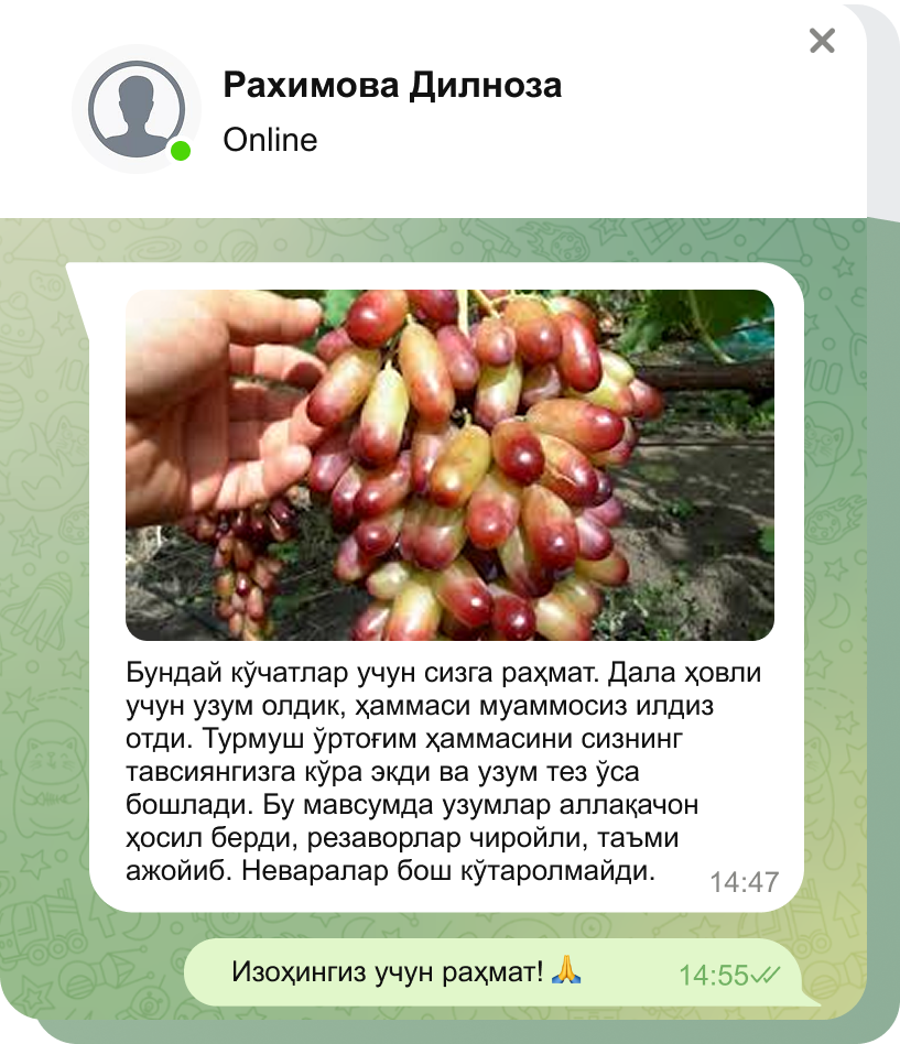 Тўғри экиш ва парваришлаш билан узум сизни мўл ҳосил билан хурсанд қилади.